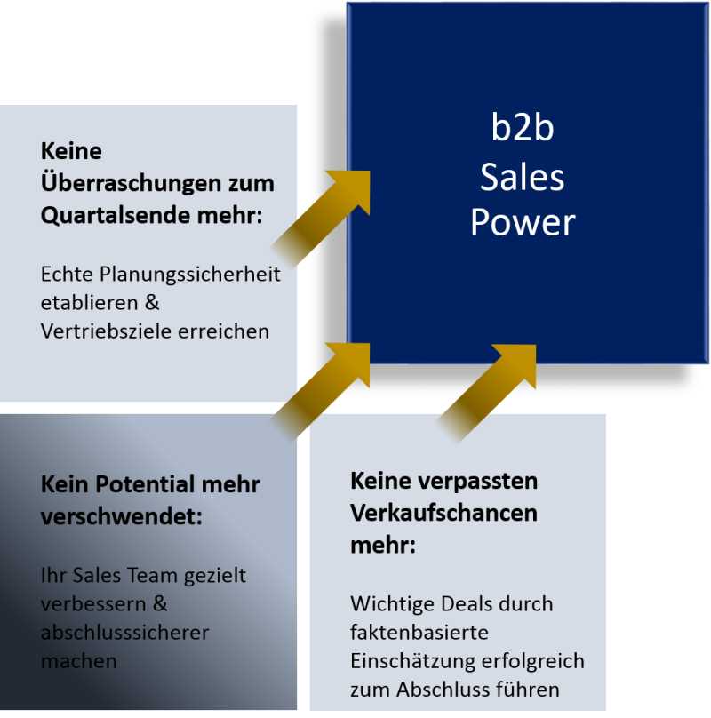 Wir konzentrieren unser b2b Sales Power Programm auf Sales Deals: Leads besser weiterentwickeln, Deals wiederholt stichfest analysieren und nur die aussichtsreichsten mit entsprechender Fokussierung weiterverfolgen. Mit der richtigen Taktik Deals in Aufträge umwandeln und dies vorausschauend durch Deal Scoring punktgenau im Forecast prognostizieren.
